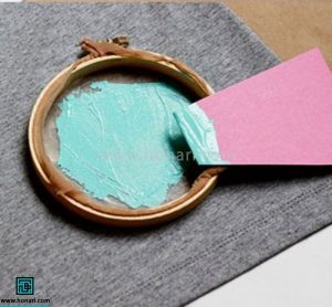 7- حال کارگاه را در جای دلخواه روی لباس قرار میدهیم. داخل طرح مقداری رنگ میریزیم. (دقت کنید که میزان رنگ متناسب با اندازه طرح باشد )