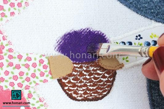 در این مرحله با استفاده از قلم موی شماره 10 و رنگ بنفش و با حرکت دایره ای قلم مو، پس زمینه ای در بالای سبد خرید نقاشی می کنیم.