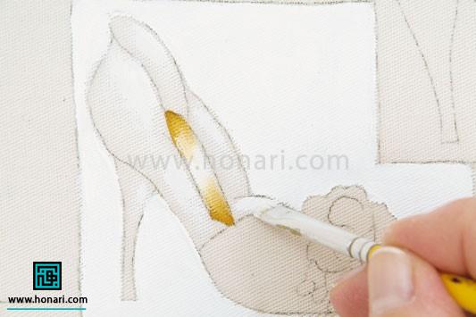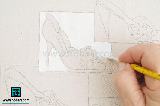 با کمک قلم موی شماره 6 و رنگ سفید، مطابق تصویر با حرکت دایره ای داخل مستطیل و اطراف کفش رو رنگ آمیزی می کنیم.