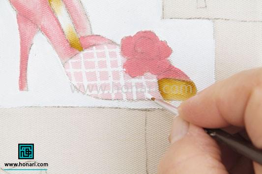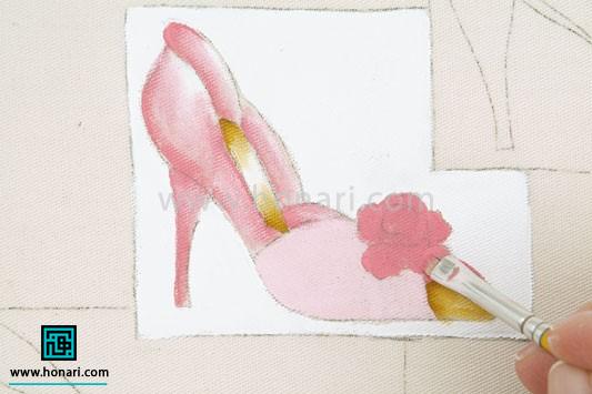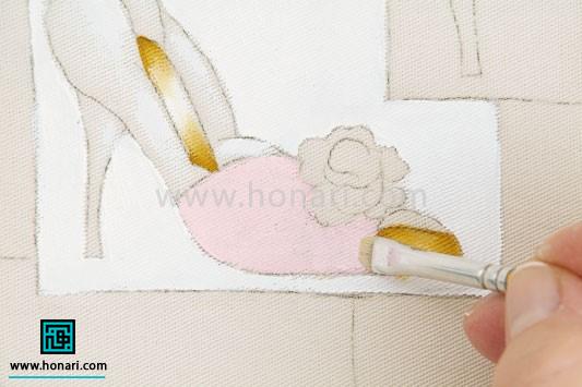 در ادامه آموزش نقاشی روی پارچه با مقداری رنگ صورتی کم رنگ و قلم موی 6، قسمت بیرونی نوار روی کفش رو رنگ آمیزی می کنیم.