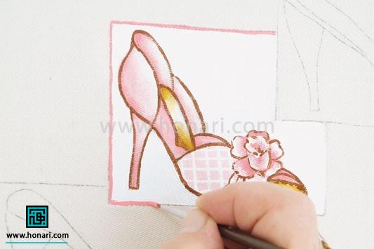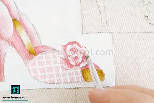 با قلم موی شماره 2 بخش های روشن گلبرگ های گل سرخ روی کفش رو با یک لایه رنگ سفید مشخص می کنیم.