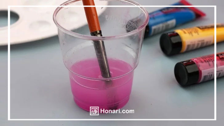 قلم مو را در یک کاسه آب یا حلال بریزید و آن را بچرخانید تا باقیمانده رنگ تا حد ممکن پاک شود.