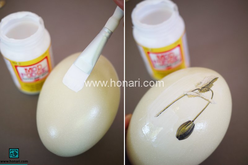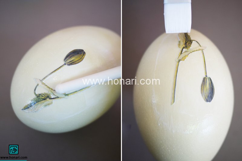 قبل از این که چسب خشک شه با استفاده از ته قلم مو و ضربه ی آروم روی طرح حباب های هوای زیر طرح رو خارج میکنیم بعد برای اینکه طرح کاملا روی کار بخوابه یک لایه ی نازک دیگه چسب روی اون میزنیم(نگران رنگ سفید چسب نباشید چون بعد از خشک شدن بی رنگ و شفاف میشه)