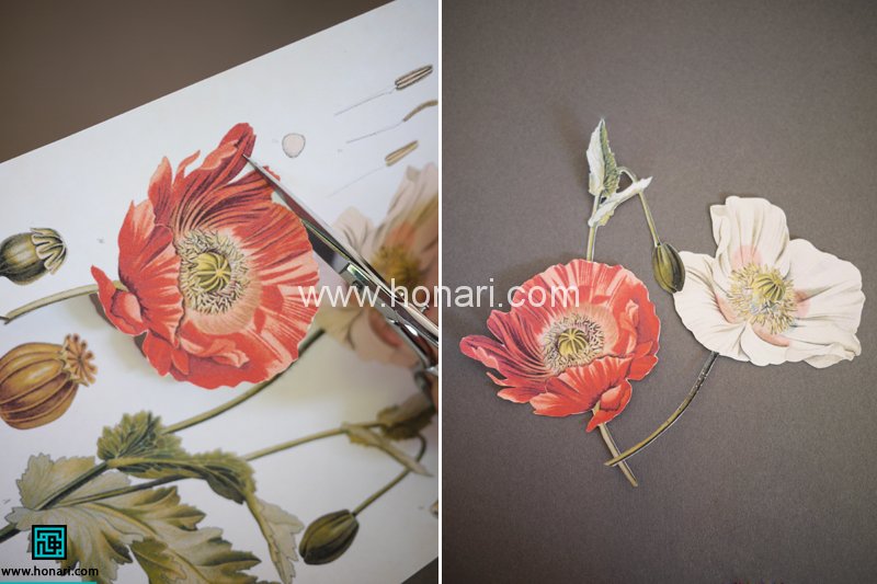 طرح هایی که میخوایم رو با استفاده از قیچی از دستمال کاغذی یا کاغذ دکوپاژ میچینیم تا جایی که ممکنه طرح ها رو روی مرز خودشون بچینید و سعی کنید سفیدی دستمال توی طرحتون نمونه