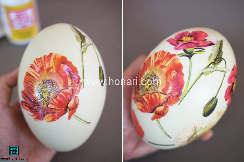 اجازه میدیم چسب خشک شه و بعد یک طرح دیگه رو اضافه میکنیم،بعد از اضافه کردن هر طرح حدود پونزده تا بیست دقیقه صبر کنید. تا چسب خشک شه بعد از چسبودندن همه ی طرح ها و خشک شدن اون ها،یک لایه چسب روی کل تخم مرغ بزنید