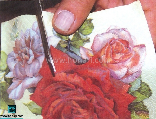 سپس مانند قبل طرح یا نقش مورد نظر را با قیچی از روی دستمال دورگیری کرده و جدا میکنیم