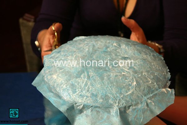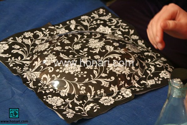 پس از اتمام کار و خشک شدن چسب، از لبه های کار دستمال های اضافه را جدا کرده و از یک سمباده بسیار نرم برای یک دست شدن آن استفاده کنید و در انتها مقداری کیلر بر روی کار اسپری کنید.