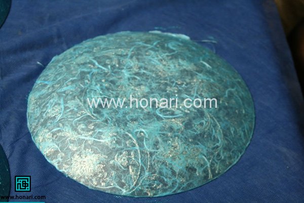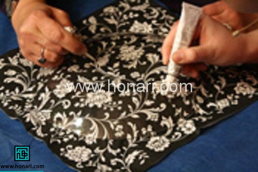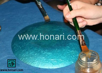 پس از طراحی با خمیر دورگیر، پشت کار را با استفاده از چسب چوب شفاف که بسیار رقیق شده است