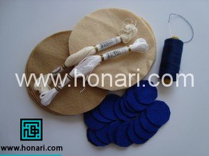 دو تا دایره ی بزرگ هم اندازه از نمد كرمی و چند دایره ی كوچیك از نمد آبی تیره بچینید.دو دایره ی كرمی رو روی هم بگذارید