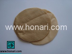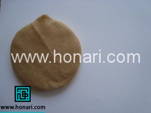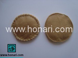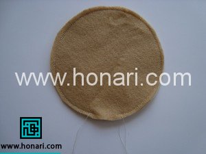 دو قطعه ی دایره ی كرمی رنگ رو با دور دوزی با نخ معمولی بدوزید اما یك قسمت كوچیك رو برای وارد كردن پشم شیشه، دوخته نشده باقی بذارید.