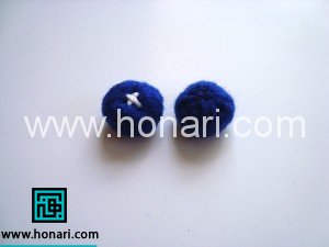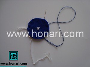 حالا نوبت میرسه به بلوبری های روی پنكیك های نمدی مون.وسط هر دایره ی آبی یك ضربدر با نخ دمسه ی سفید بدوزید.بعد دور دایره رو با نخ معمولی هم رنگ نمد آبی دوخت بزنید به طوری كه نخ رو زیر و روی نمد میبرید.به تصویر زیر دقت كنید تا كاملا متوجه بشید.
