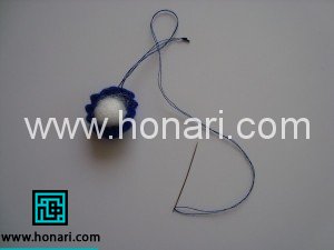 یك قطعه ی كوچك پشم شیشه گلوله كنید و وسط دایره بگذارید بعد نخ آبی رو بكشید تا دایره جمع بشه .