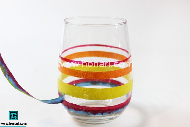 طریقه دیگر برای رنگ کردن ظرفی که به مهارتی نیاز نداشته باشد، ایجاد کردن خط روی ظرف است. شما تنها کاری که لازم است انجام دهید، نقاشی کردن درون فاصله بین نوارچسب است. از قیچی استفاده کنید، نوار چسبتان را از وسط برش بزنید و یا حتی می توانید نوارچسب را از وسط به سه قسمت برش بزنید. ( پهنای نوار چسب فاصله بین خط ها روی تنگ را مشخص کند). بنابراین، اگر می خواهید فاصله بیشتری بین خطوط روی تنگ داشته باشید، می توانید نوارچسبتان را نازک نکنید و نوارچسب را همان گونه که هست استفاده کنید.)