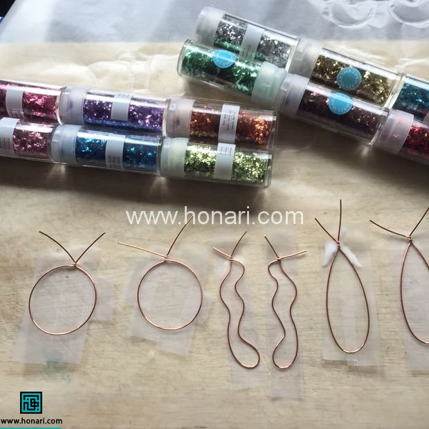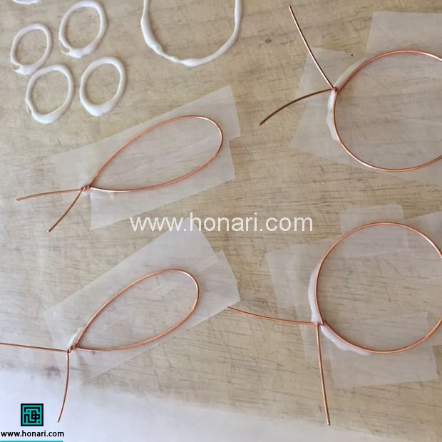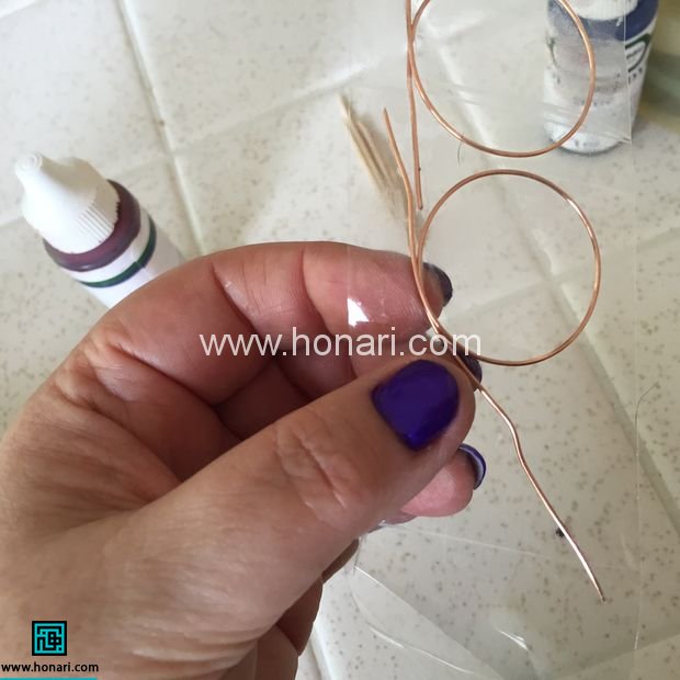 دو قطعه ۱۵ سانتی متری از سیم مسی را جدا کرده و هر شکلی را که دوست دارید به سیم ها بدهید. برای این کار می توان سیم را به دور یک قوطی پیچید. البته برای گوشواره هایی که طرح گرد دارند. سپس سیم را سفت کنید تا تغییر حالت ندهد.