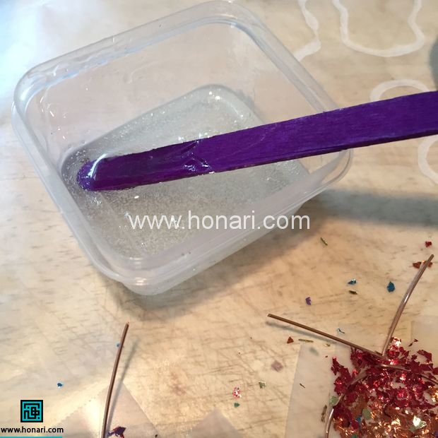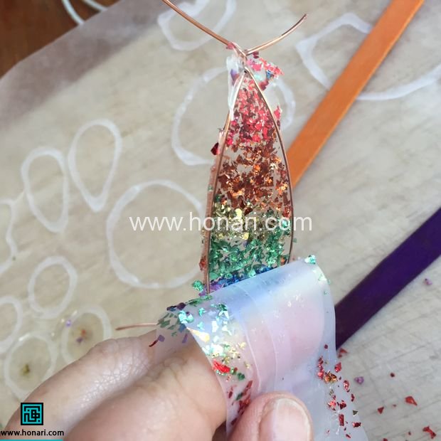 بعد از این مدت از یک چوب بستی یا هر وسیله دیگری استفاده کرده تا رزین ها را بر روی گوشواره ها منتقل کنید. سطح داخل گوشواره را با استفاده از رزین کاملا پر کنید. البته نه به اندازه لبریز شدن. بلکه تا حدی که قالب گوشواره کاملا پر شود کفایت می کند.