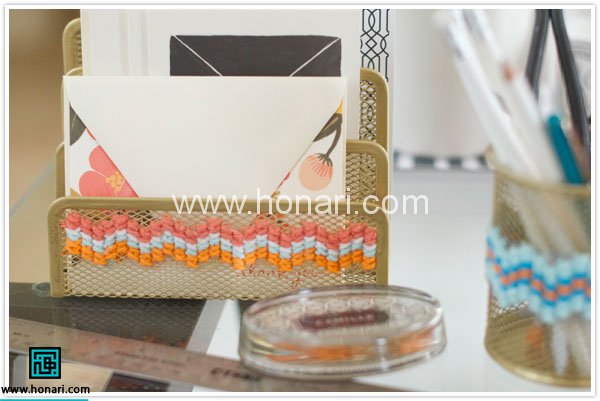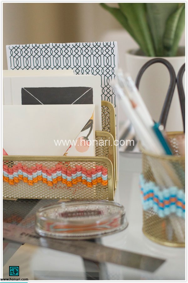 همونطور که میبینید با چندتا کوک ساده و به راحتی میشه وسایل روی میز کار یا مطالعه مون رو از یکنواختی در بیاریم به میزمون. جلوه های رنگارنگ بدیم،این روش رو میتونید روی جا قلمی هم انجام بدید (مثل شکل بالا) پس به اطرافتون خوب نگاه کنید و هر وسیله ای که ظاهرش براتون یکنواخت شده با این روش تزیین کنید