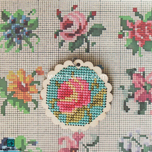 حالا با توجه به الگو دوخت رو شروع كنید،خانه های طرح رو با رنگ های منطبق با الگو دوخت ضربدری بزنید،دقت كنید كه شمارش خونه های الگو در شماره دوزی اهمییت زیادی داره پس تعداد خونه ها روی قاب گردنبند دوخت بزنید