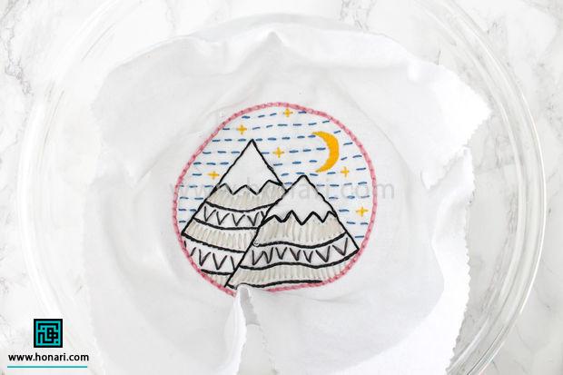 گلدوزی را از روی کارگاه بردارید و آن را بین دو دست خود بگیرید و آب سرد روی آن بریزید تا زمانی که نشانه ها یا مارکرهای روی ان ناپدید گردد.