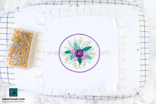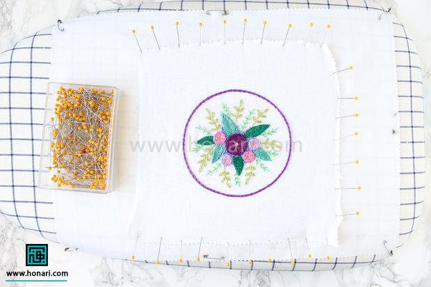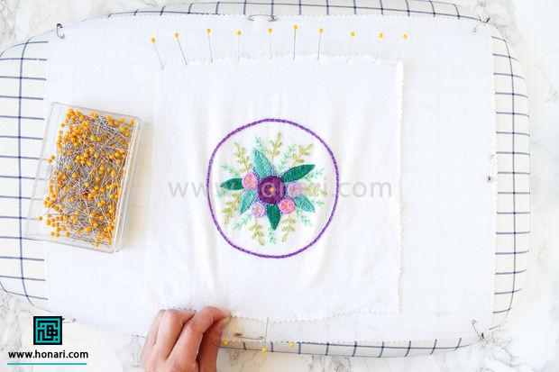 در ابتدا زمانی که گلدوزی را می بندید، به آرامی اب بر روی آن اسپری نمایید و اجازه دهید که به طور کامل خشک گردد. زمانی که خشک می گردد، سنجاق ها را از آن جدا کنید. گلدوزی ظاهری دوست داشتنی خواهد داشت و به اسانی قابل نصب بر روی قاب یا کارگاه است.