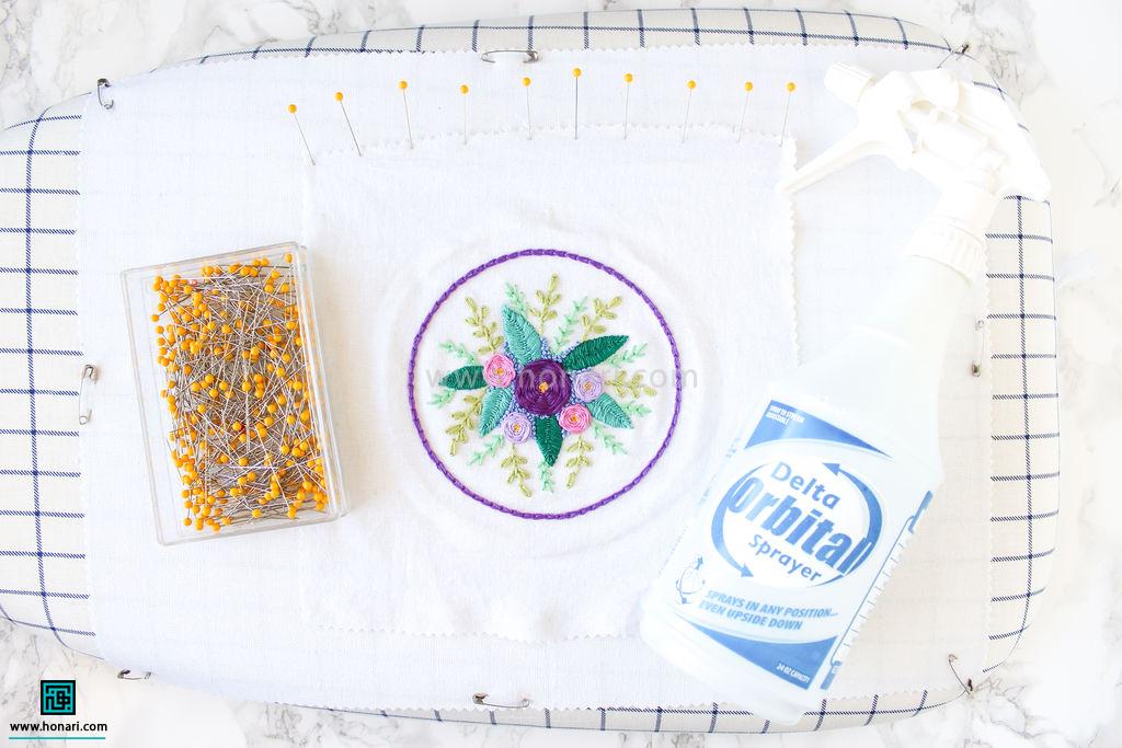 در صورتی که گلدوزی شما خشک است، به آرامی آن را با اسپری آب مرطوب نمایید. بهتر است که کمی آن را دارای رطوبت نگه دارید اما آن را خیلی مرطوب و خیس نکنید. اگر گلدوزی خیلی خیس و مرطوب باشدباعث می شود که سنجاق ها در طول فرایند کار زنگ بزنند.