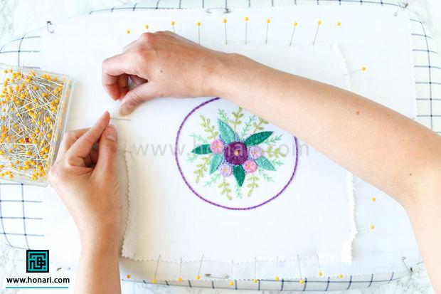 از بخش مرکزی کار را شروع کنید و به سمت لبه ها کار کنید، سنجاق ها را همگی در بالای لبه گلدوزی قرار دهید. من به صورت طبیعی این کار را برای هر 2 سانت فاصله انجام می دهم اما برای گلدوزی با جزئیات بیشتر شما ممکن است که بخواهید سنجاق ها را نزدیک هم قرار دهید.