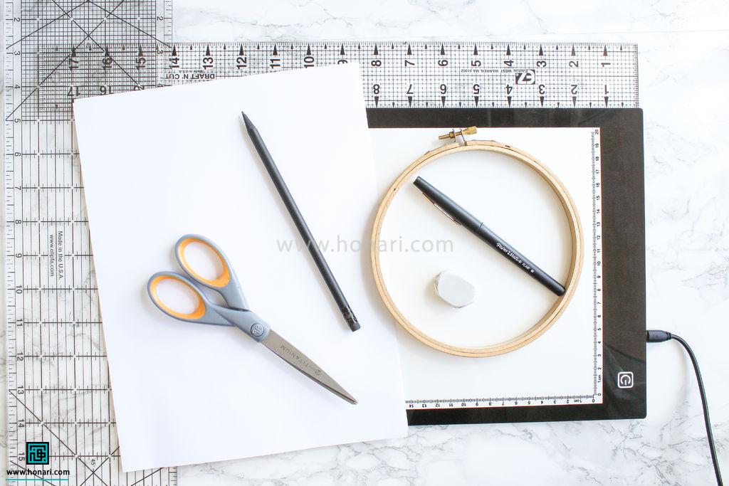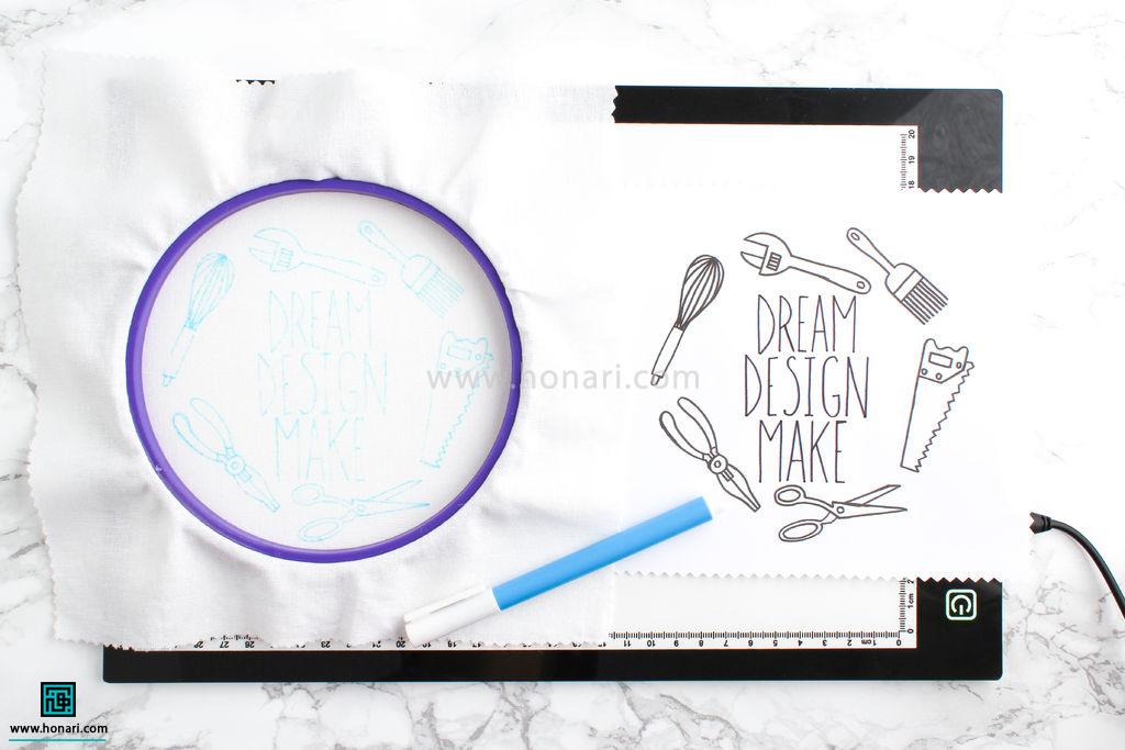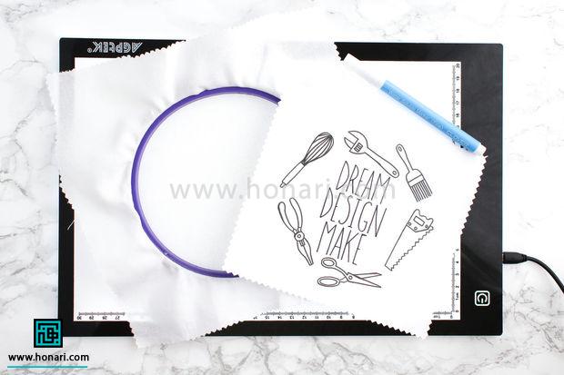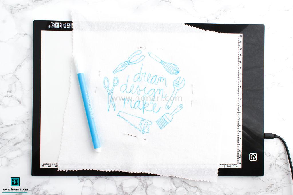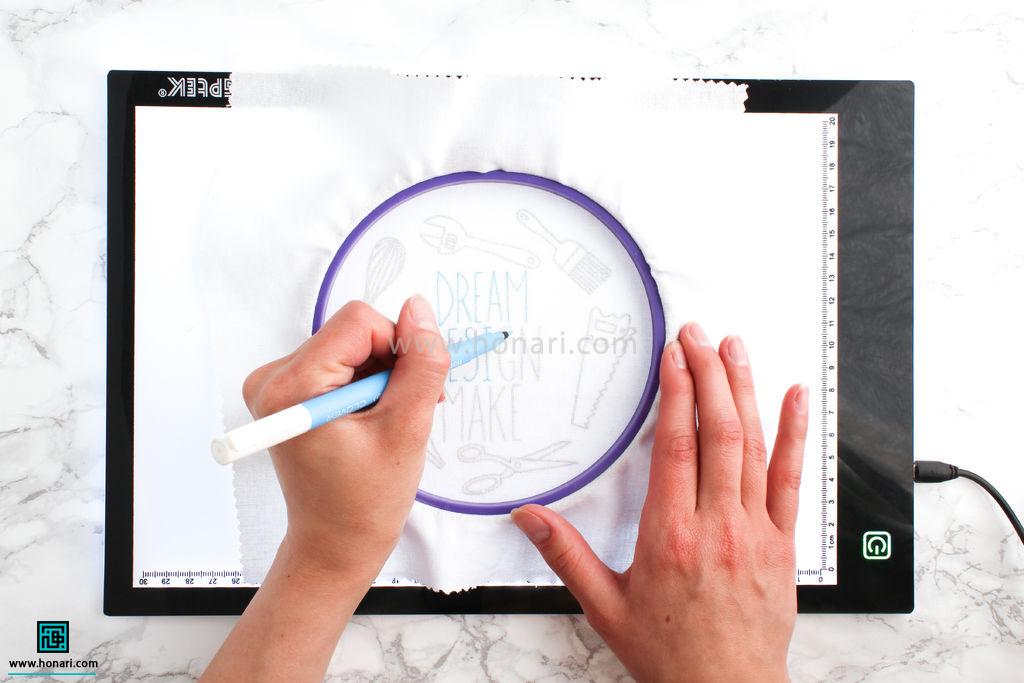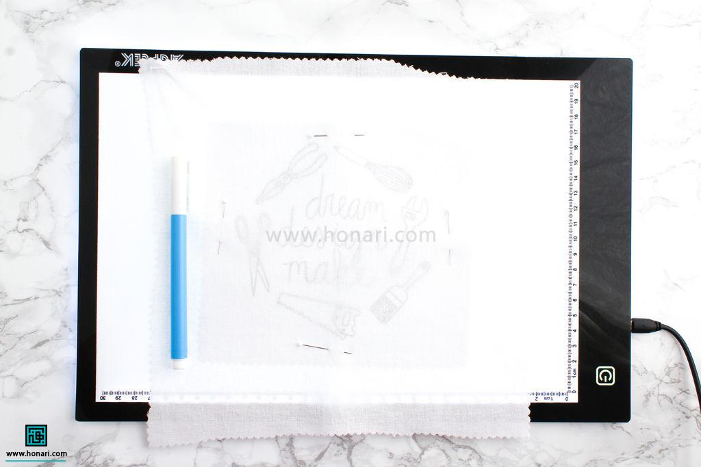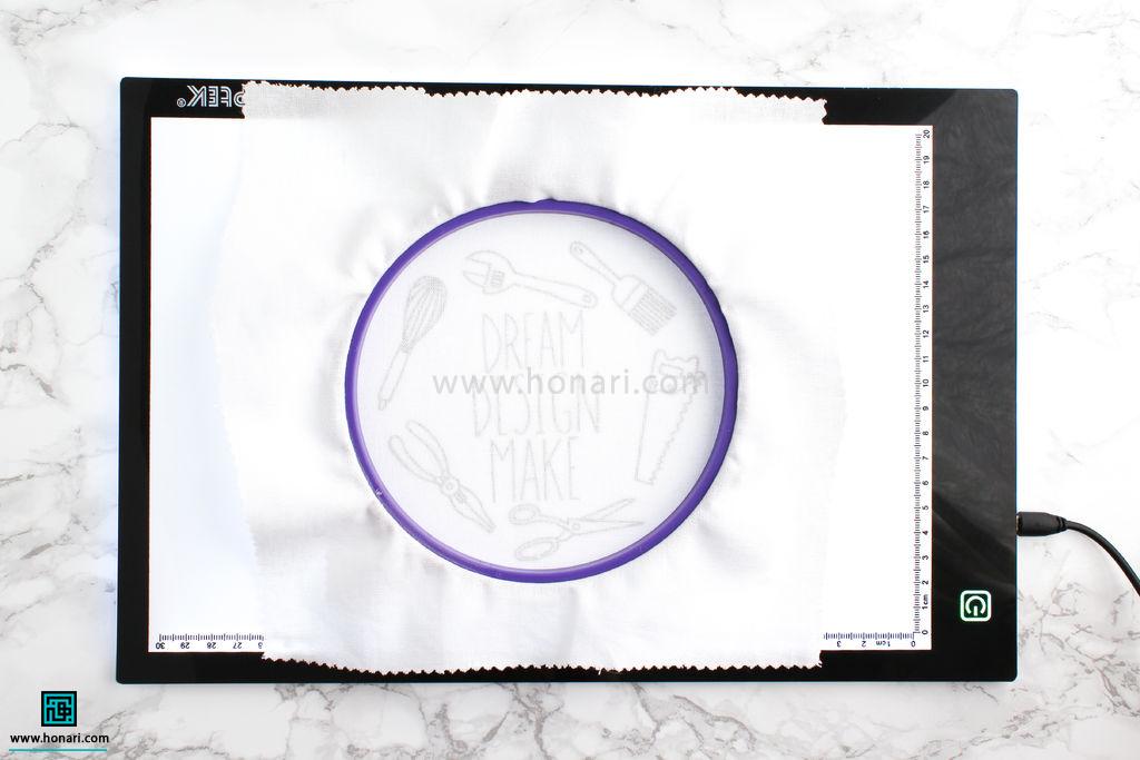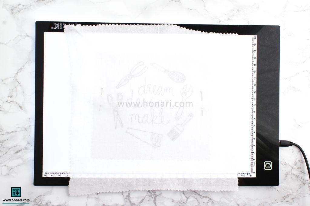 اول، پارچه را بر روی کارگاه قرار بدید و اطمینان داشته باشید که الگو در وسط قرار گرفته و محکم شده. در صورتی که شما از پنجره برای ردیابی استفاده می کنید، الگوی کاغذ را بر روی پنجره و در ارتفاع مناسبی قرار بدید. در صورتی که شما از میز نور یا تبلت استفاده می کنین، تنها الگوی کاغذی را در بالای آن قرار بدید.