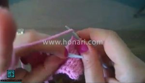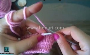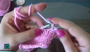 6- دانه بعدی را ساده می بافیم. در این روش سوراخ در بافت ایجاد نمی شود و فقط دانه اضافه کرده ایم.