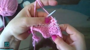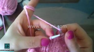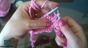 4- اگر بخواهیم بدون سوراخ افتادن دانه اضافه کنیم، باید کاموا را از سمت پشت روی میل راست بیندازیم.