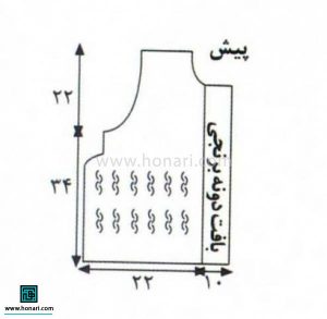بعد از این بافت بشکل ساده بافی ادامه بدید. به استثنا سجاف. قد بافت به 34 سانتی متر رسید برای حلقه 1-2-3 کور کنید. قد بافت به 47 سانتی متر که رسید1-1-3-4-12 دانه کم کنین و ما بقی دونه ها را وقتی قد بافت به 56 سانتی متر رسید یکباره کور می کنیم. پیش دیگه هم به همین شکل بافته میشه و 3 تا جا دکمه دوتایی در قسمت بالا ایجاد می کنیم.
