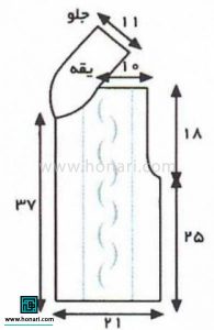 2 ): قد بافت که به 25 سانتی متر رسید، برای حلقه آستین از هر دوطرف 1+2+3 دانه.