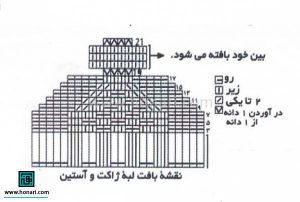 بعد از اتمام نقشه 20 سانتی متر رو بافی انجام داده،سپس،بعد از 8 دانه ی سجاف،نصف(نقشه ی بافت روی جلو،پشت و آستین) را شروع می کنیم.(باتوجه به جلوی سمت راست یا چپ،نقشه تقسیم شود.)راه بردن دانه ها را ادامه می دهیم تا دانه های جودانه به 12 دانه برسد.