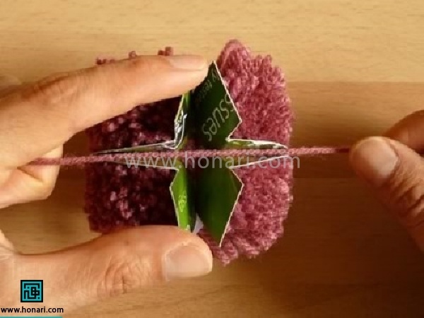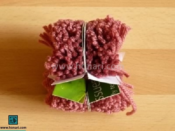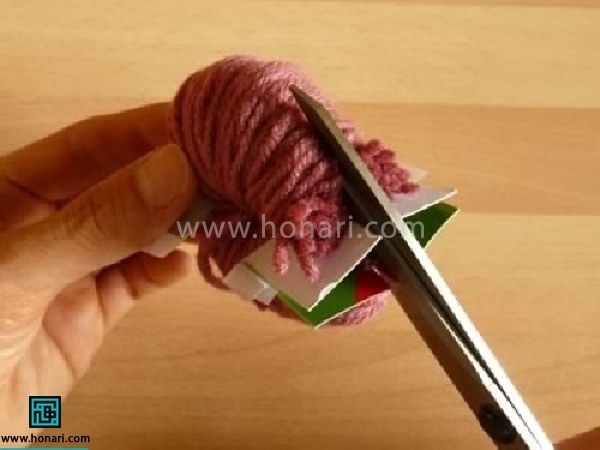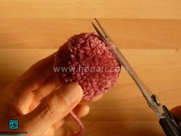 12-به کمک قیچی توپک را مرتب کنید. برای راحتی کار مخصوصا در صورتی که به تعداد بالا از این توپک ها نیاز باشد، بهتر است از منگوله ساز استفاده کرد.