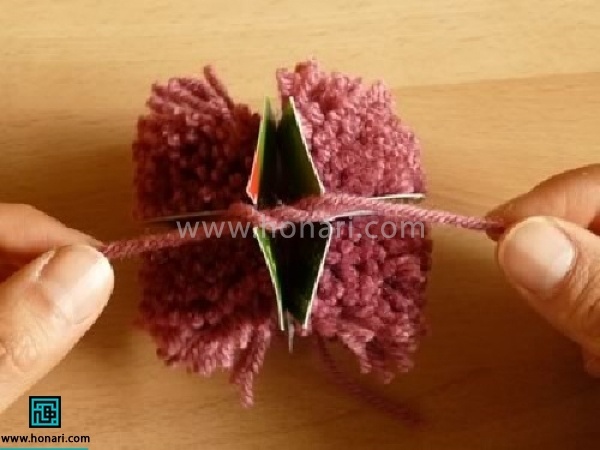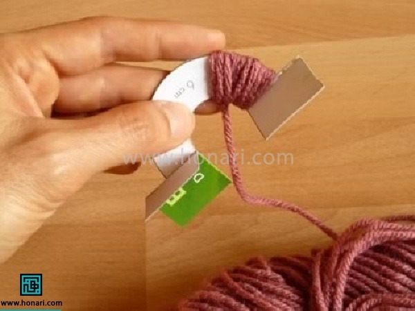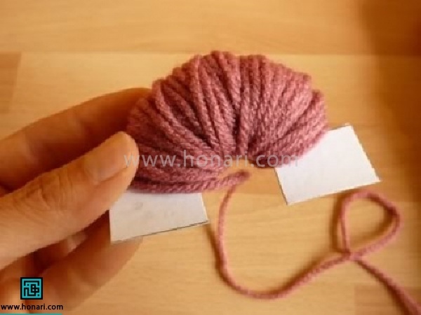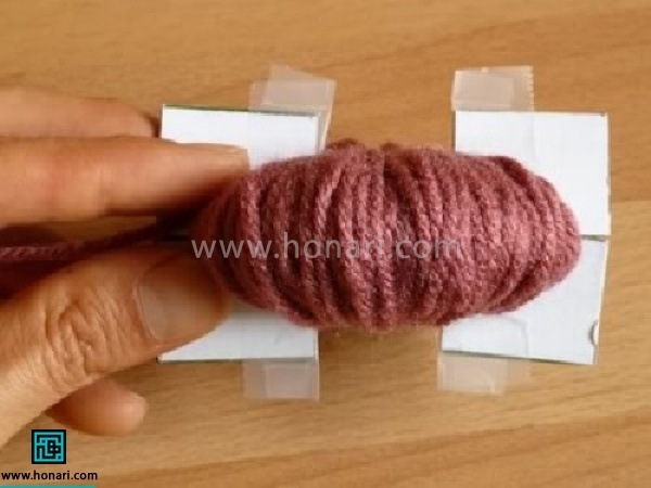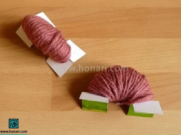 10- یک کاموا برداشته از بین دو مقوا دور کامواها ببندید و محکم کنید.