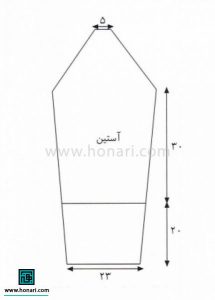 20 سانتی متر دیگر بدون اضافه یا کور کردن می بافیم.10 سانتی متر مانده به حلقه آستین هر 6 رج یک بار 3دفعه 1 دانه اضافه می کنیم.قد بافت به 55 سانتی متر که رسید برای حلقه آستین 3 دانه کور می کنیم.در طول 22 سانتی متر در رج های رفت،در یک طرف 1 دانه کور می کنیم.قد بافت به 65 سانتی متر که رسید.برای یقه از سمت دیگر هر 3 رج یک بار 1 دانه کور می کنیم. از سمت حلقه آستین به کور کردن ادامه می دهیم تا اینکه 1 دانه باقی بماند.