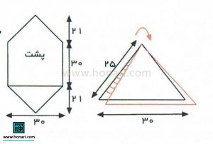 بعد از آن،این بار برعکس،یعنی هر رج در سمت راست و چپ 1 دانه های نبافته را هم می بافیم تا دوباره به 40 دانه برسد و پشت مثلث را تکمیل می کنیم.