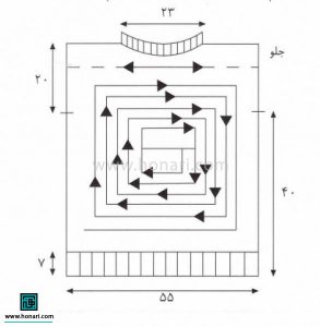 با نخ اسپورت موتیف 21 دانه سر انداخته و ساده می بافیم. یک قسمت رنگی نخ به اتمام که رسید، دانه ها را کور می کنیم. از سمت کوتاه تکه بافته شده در جهت بافت دانه در آورده و دوباره تا اینکه قسمتِ رنگی دیگر نخ تمام شود می بافیم. این کار را به صورت چرخشی ادامه می دهیم. قد بافت به 50 سانتی متر که رسید، دیگر به سمت بالا ادامه نداده و فقط در هر دو طرف بافت به موتیف ها ادامه می دهیم تا اینکه عرض بافت به 55 سانتی متر برسد. بعد، دانه در آورده و 3 سانتی متر می بافیم.