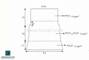 با کاموا 4684 (سبز آبی) بورجوم اسپورت 40 دانه سر انداخته، و آن را بصورت 1 رج رکن و 3 رج ساده تکرار کرده، سپس از هر دو طرف در رجهای رفت 1 دانه اضافه کرده و به 50 دانه می رسانیم. پس از آنکه قد بافت به 12 سانتی متر رسید،آن را بصورت 3 رج ساده با کاموا 4684 و 1 رج رکن با کاموا 3379 (قرمز زرد) تکرار کرده و 22 سانتی متر می بافیم. سپس با کاموا 3379 (قرمز زرد) بصورت 1 رج رکن و 3 رج ساده تکرار کرده و 6 سانتی متر می بافیم. بعد از آن برای حلقه آستین از هر دو طرف 3+2+1 دانه، و در رجهای رفت بعدی از هر دو طرف 1 دانه کور کرده، که 8 دانه که باقی ماند، سپس همه آن دانه ها را کور می کنیم.