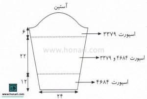 با کاموا 4684 (سبز آبی) بورجوم اسپورت 82 دانه سر انداخته، بصورت 1 رج رکن، 3 رج ساده تکرار کرده و از هر دو طرف هر 3 رج یک بار در رج برگشت 1 دانه کور می کنیم تا اینکه 72 دانه باقی بماند. از این پس بصورت 3 رج ساده با کاموا 4684 (سبز آبی) و 1 رج رکن با کاموا 3379 (قرمز زرد) تکرار کرده و 15 سانتی متر می بافیم. بعد از آن برای حلقه آستین از هر دو طرف 3+2+1 دانه کور میکنیم، قد آستین که به 19 سانتی متر رسید، همه دانه ها را کور می کنیم.