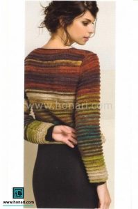 پس از اینکه قد بافت به 12 سانتی متر رسید، بصورت 3 رج ساده با کاموا (سبز آبی) و 1 رج رکن با کاموا برجوم اسپرت کد 3379 (قرمز زرد) تکرار کرده و 15 سانتی متر می بافیم. بعد از آن، برای حلقه آستین 3+2+1 دانه کور کرده، سپس 11 سانتی متر دیگر بافته و برای گودی یقه از سمت دیگر 1+2+3+4+5+7 دانه کور می کنیم. پس از اینکه قد حلقه آستین به 19 سانتی متر رسید، برای سرشانه 11 دانه کور می کنیم.