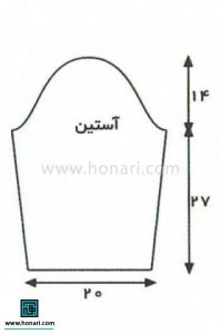 با نخ مشکی 60 دانه سرانداخته، مانند نقشه می بافیم.قد بافت به 25 سانتی متر که رسید.برای حلقه آستین از هر دو طرف 3+2+1 دانه کور کرده.قد بافت به 43 سانتی متر که رسید.دانه های باقی مانده را کور می کنیم.