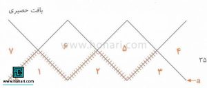 بافت حصیری (اَنترَلاک): 60 دانه سر می اندازیم. مثلث اول: 1 دانه بافته بر می گردیم، 2 دانه بافته بر می گردیم. 3 دانه بافته بر می گردیم. به این ترتیب ادامه داده تا تعداد دانه ها 15 دانه بشود. آخرین رجمان به این ترتیب باشد که 15 دانه را بافته و بر نمی گردیم. مثلث دوم: 15 دانه مثلث اول را روی میل راست نگه داشته و 1 دانه بافته و بر می گردیم. 2 دانه بافته و بر می گردیم. به این ترتیب ادامه می دهیم تا مثلث دوم 15 دانه ای هم درست شود. مثلث سوم: مانند مثلث دوم درست کرده و دانه ها را نگه می داریم تا اینکه 60 دانه به اتمام برسد. مثلث چهارم: برای نصف مثلث به این ترتیب کار می کنیم: 1 دانه بافته، بر می گردیم و به 1 دانه از دانه های مثل سوم به دانه هایمان اضافه می کنیم. 2 دانه می شود. رج بعدی 1 دانه دیگر هم به دانه هایمان اضافه کرده، دانه هایمان 3 دانه می شود. به این ترتیب تعداد دانه ها به 15 که رسید، برای مثلث پنجم از سمت دیگر مثلث سوم، 15 دانه در آورده، همه آنها را بافته و بر می گردیم. به این ترتیب در هر رج برگشت، 1 دانه از دانه مثلث دوم و 1 دانه از دانه آخر رج را 2 تا یکی کرده بر می گردیم. به این ترتیب همه دانه های مثلث دوم را کور کرده و برای لوزی ششم از سمت چپ مثلث دوم 15 دانه در آورده و بر می گردیم. در رج بعد این بار 15 دانه سمت راست مثل اول را تک تک کور می کنیم تا مثلث ششم کامل شود.