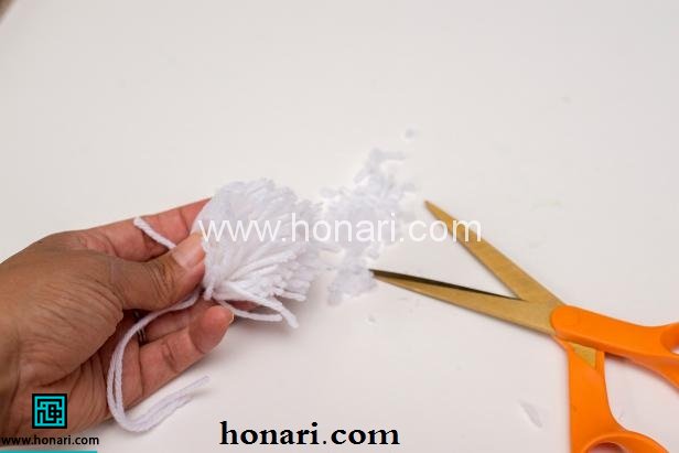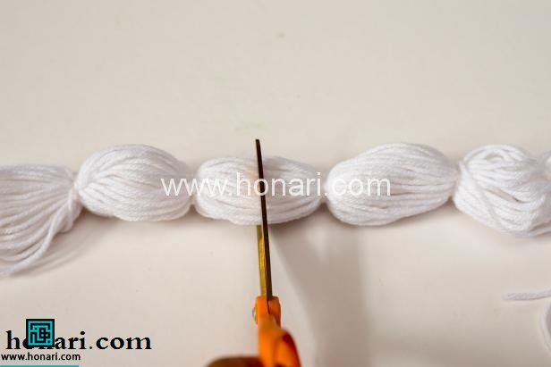 در این مرحله باید با استفاده از قیچی کاموا ها را بچینید. در تصویر بالا کاملا مشخص است. این کار را به طریقی انجام دهید که گره باز نشود. بهتر است از وسط هر قسمت ایجاد شده قیچی کنید. بدین ترتیب در هر قسمت به دست امده یک گره وجود دارد که موجب می شود کار شما محکم شده و باز نشود.