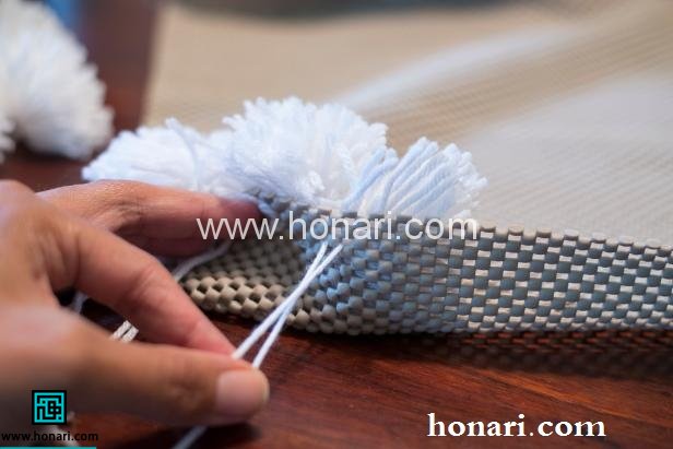 خوب حالا به تعداد مورد نیاز از این گلوله های کاموایی باید تهیه کنید. می توانید این گلوله ها را رنگی یا ساده و تک رنگ آماده کنید. حالا این گلوله ها را روی توری قرار داده و طبق شکل نخ های اضاف آمده از هر گلوله را به زیر توری گره بزنید. با این روش گلوله های کاموایی بر روی توری فیکس شده و باز نمی شوند.