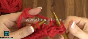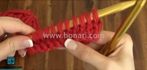 2- رج سوم را به این صورت می بافیم: دانه اول را زیر میبافیم، دانه دوم را نبافته به میل راست میبریم، دانه سوم را به زیر میبافیم، دانه چهارم را نبافته رد میکنیم، به همین ترتیب تا آخر رج را می بافیم.