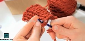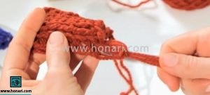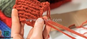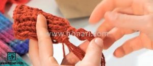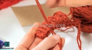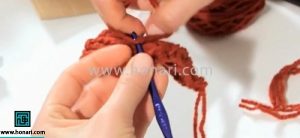 8- میتوانیم طور دیگری نیز ریشه بزنیم. به این صورت که مانند روش اول قلاب را داخل بافتنی کرده و نخ را دور قلاب بیندازید. این بار یک طرف کاموا را کامل بیرون بیاورید.