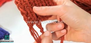 3- برای ریشه زدن معمولا از 2 نخ استفاده میکنند، تا ریشه های 4 تایی داشته باشند. قلاب را از جایی در پایین بافتنی که میخواهید ریشه به آنجا وصل باشد بیرون بیاورید.