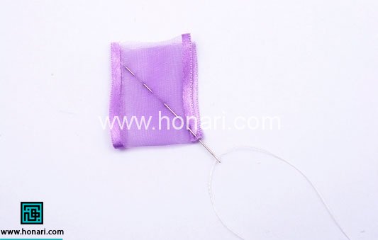 همان طور که در تصویر کاملا مشاهده می کنید، روبان را از نیمه تا کرده و با استفاده از نخ و سوزن چند کوک از قطر کار بر روی آن بزنید. بهتر است تا بعد از انجام دادن کوک ها نخ را از روبان جدا کنید. چرا که در مراحل بعد به آن نیاز دارید و موجب استحکام بیشتر کار شما می شود.