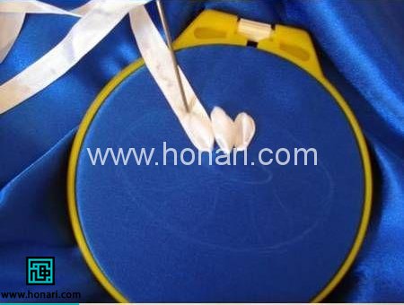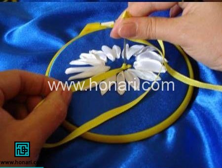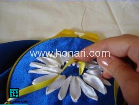 بعد از اتمام گلبرگ ها،شروع می كنیم به دوخت پرچم گل بابونه با استفاده از روبان زرد،به این صورت كه روبان را دور سوزن می پیچیم(به شكل زیر دقت كنید)