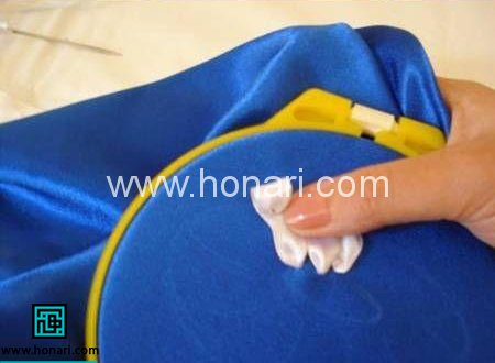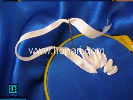 دوخت گلبرگ ها به این صورت است كه ابتدا،روبان را در قسمت انتهای گلبرگ از پشت پارچه به جلو می آورید سپس سوزن را وارد روبان در قسمت بالایی گلبرگ می كنید و از دوباره با رد شدن از روبان و پارچه به قیمت پشتی پارچه می برید(به تصاویر دقت كنید)