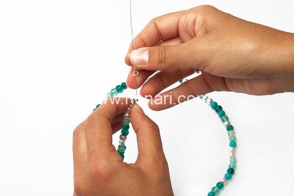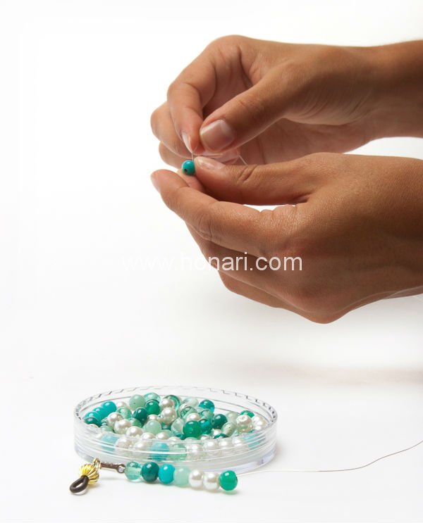 در این مرحله ابتدا یک الگو برای چیدن مهره ها و سنگ هایی که میخواین توی کارتون به کار ببرین در نظر بگیرین. حالا با توجه به الگوتون رشته شون کنین. فقط یادتون باشه فضای کافی برای خرج کار و قلاب بند عینک بعدی تون توی اون یکی سر رشته بذارید.